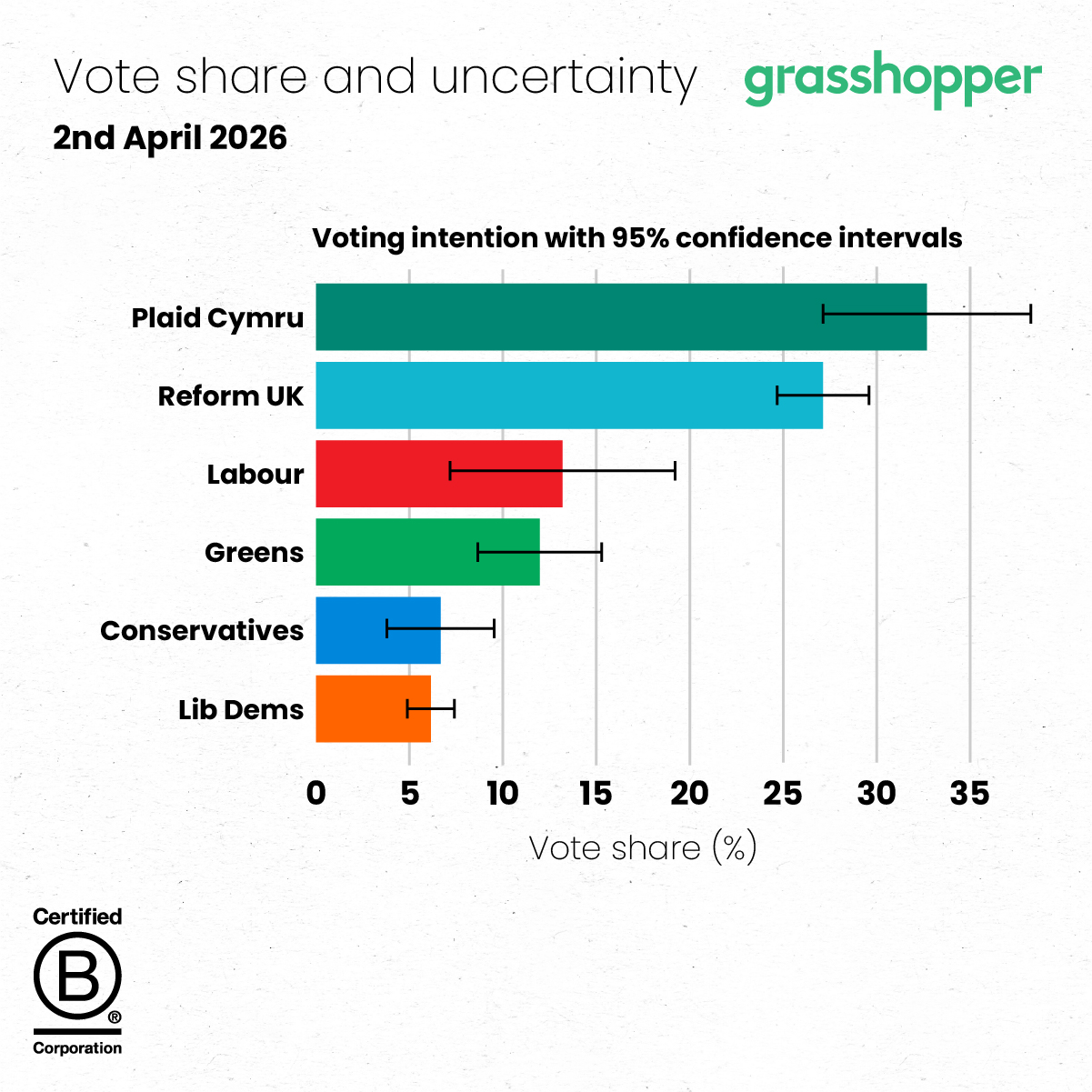 Following further polling from Beaufort Research (1st April), Grasshopper have input the data into their Senedd opinion polling probabilistic model in order to update their aggregated data.